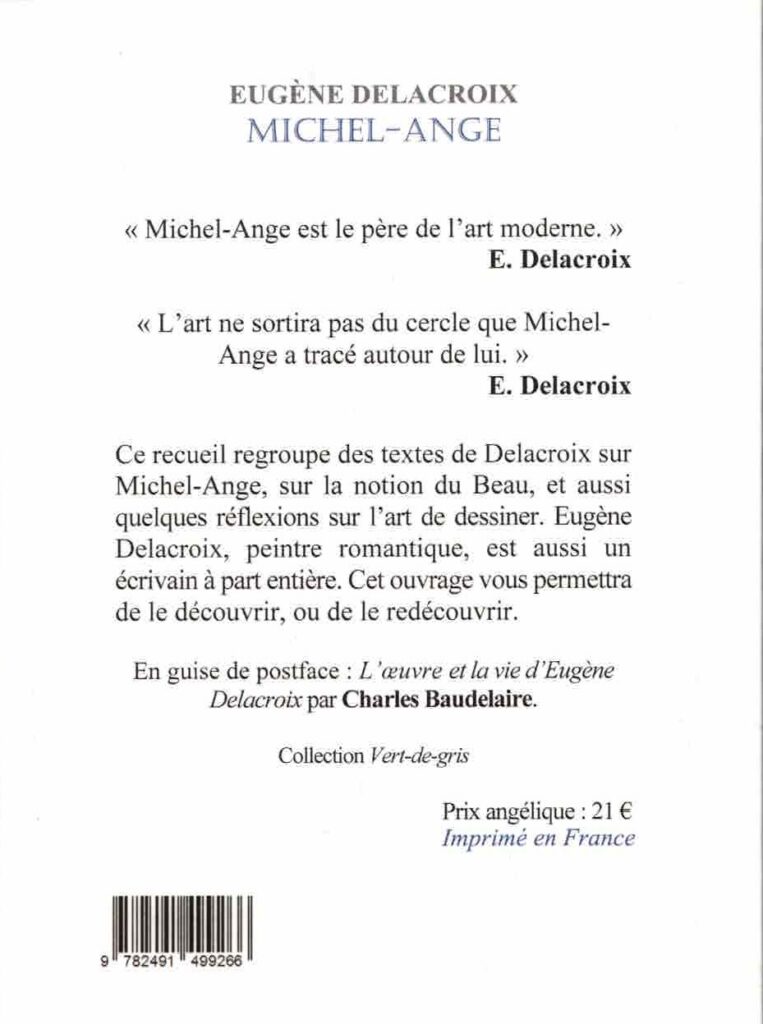 Ce recueil regroupe des textes (complets) de Delacroix sur Michel-Ange, sur la notion du Beau, et aussi quelques réflexions sur l’art de dessiner. Eugène Delacroix, peintre romantique, est aussi un écrivain à part entière. Cet ouvrage vous permettra de le découvrir, ou de le redécouvrir.